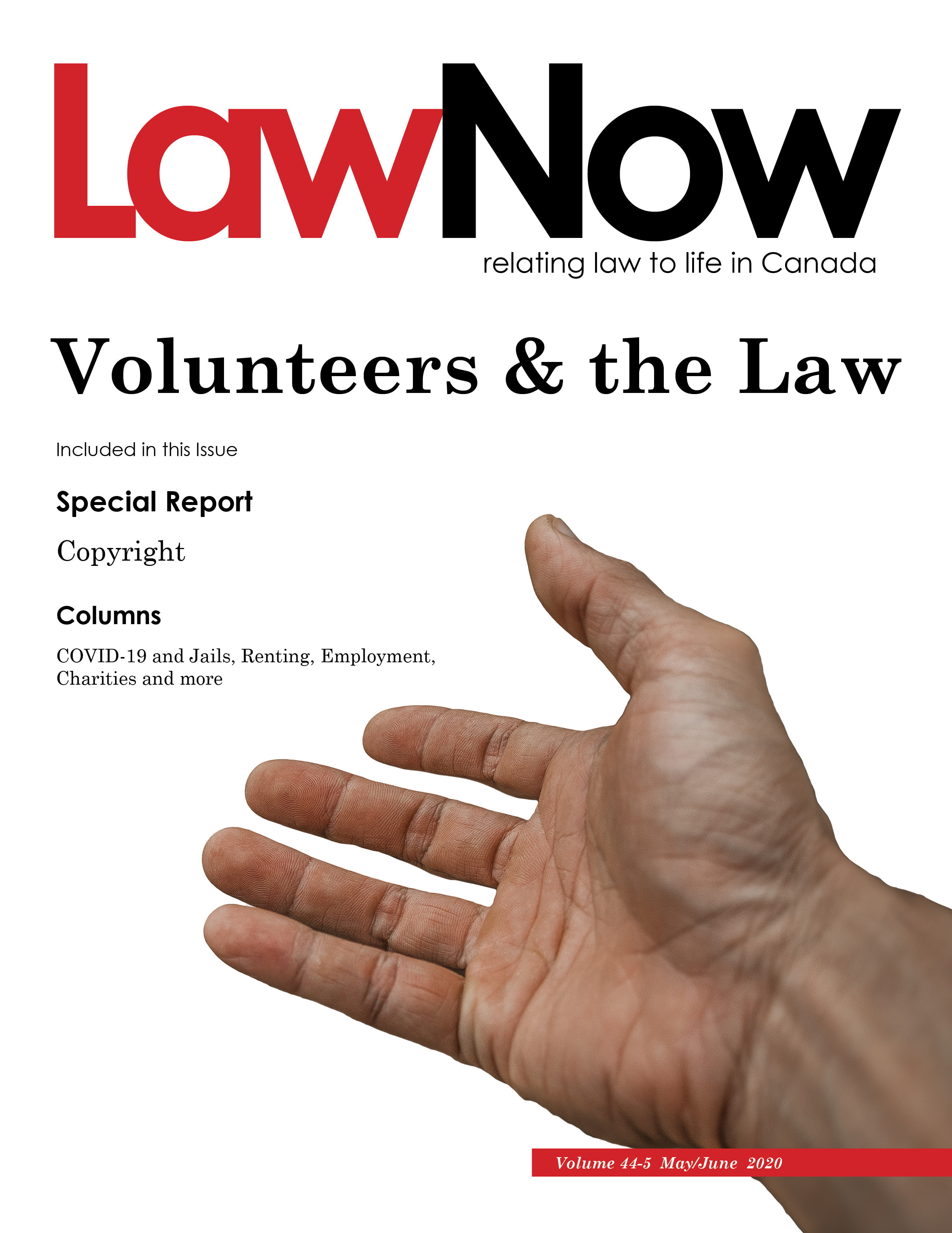 In the midst of this COVID-19 global pandemic, volunteers are stepping up more than ever to provide countless hours of manpower to various organizations. This issue of LawNow looks at the interaction of volunteers and the law. In this issue, our columnists also provide an update on how COVID-19 is impacting many aspects of our lives – from courts and renting to human rights and employment.