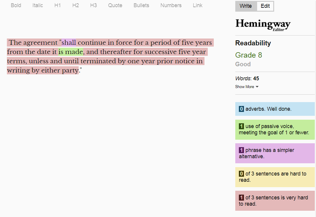Hemingway highlights parts of the text in different colours. For example, the part of the sentence that is passive will be in green and complex phrases are in purple.