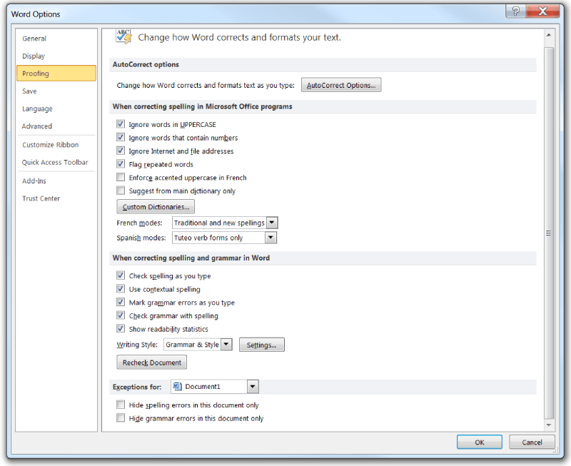 - Beside the Writing Style heading, select “Grammar & Style” and click the “Settings” button. You will get another list of items to check off.