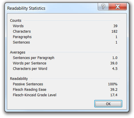 Word clearly thinks this sentence is passive and hard to read with a Flesch-Kincaid Grade Level of 17.4!