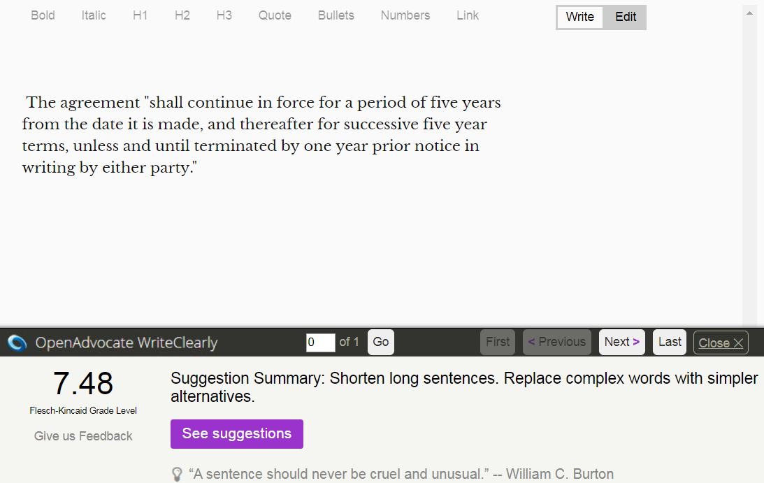 Using our Rogers’ Million Dollar Comma text, WriteClearly finds the sentence to be too long and suggests simplifying it. It does not identify the passive language in this sentence or the complex words like the Hemingway Editor. WriteClearly’s strength is giving alternative wording to complex legal language.