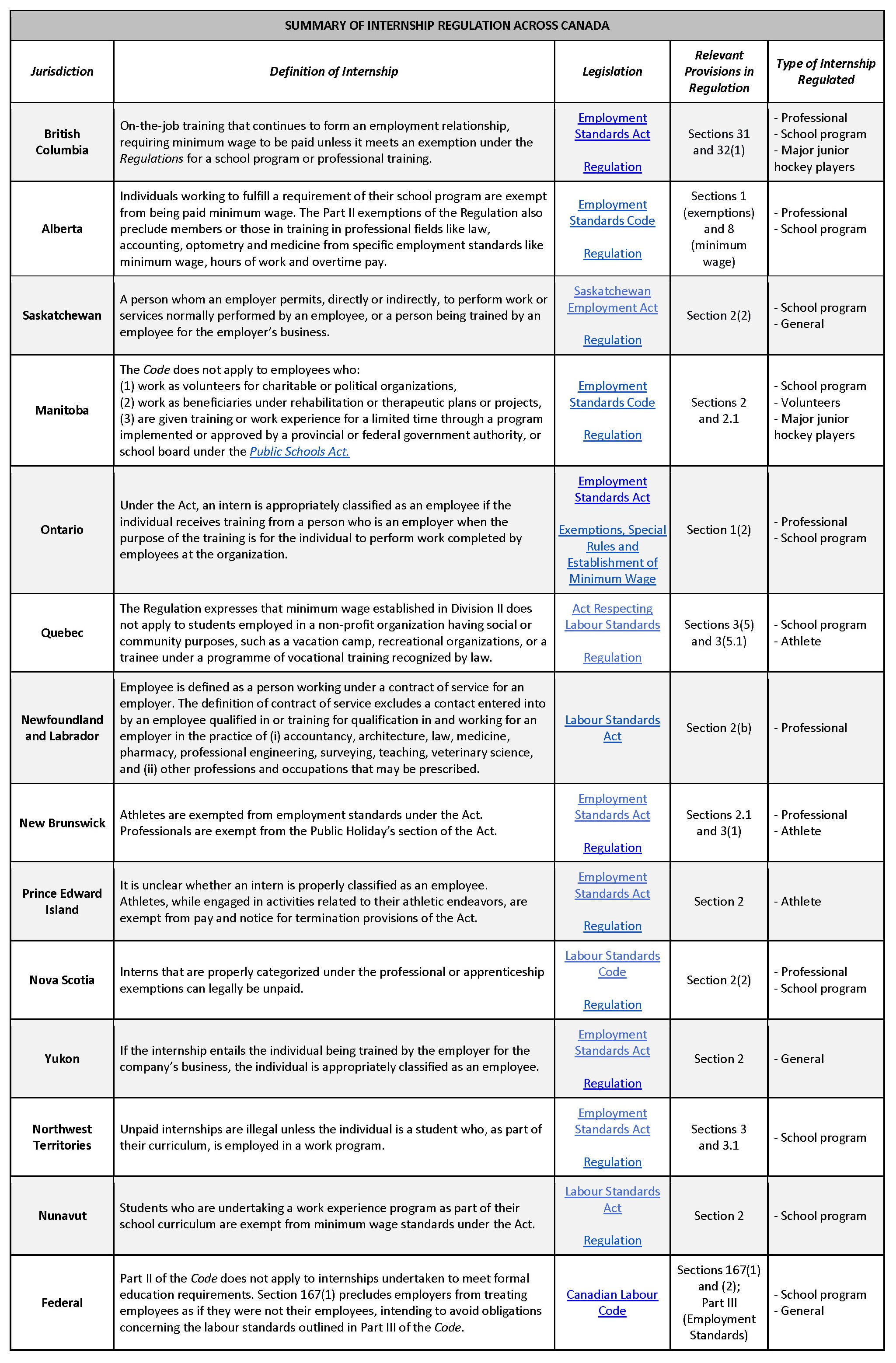 Each province and territory has employment standards legislation that applies to internships without actually using the word “internship”.